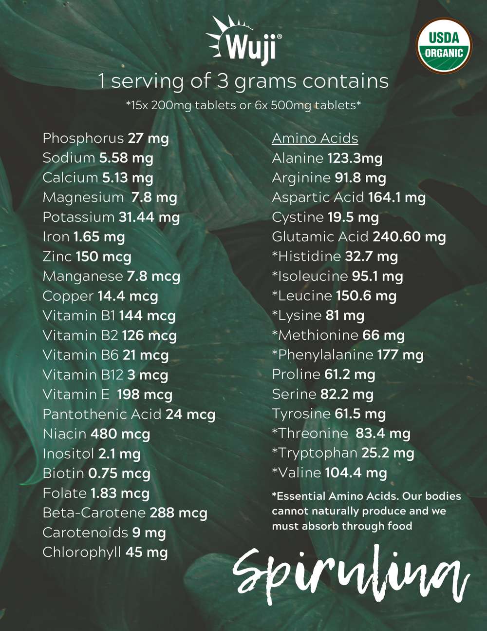 Améliorez votre santé et libérez votre potentiel grâce à notre exceptionnelle spiruline biologique ! Riche en nutriments puissants, elle offre un soutien inégalé pour la récupération musculaire, un niveau d'énergie soutenu, une glycémie équilibrée, une peau éclatante et une richesse de nutriments essentiels pour nourrir votre corps de l'intérieur.